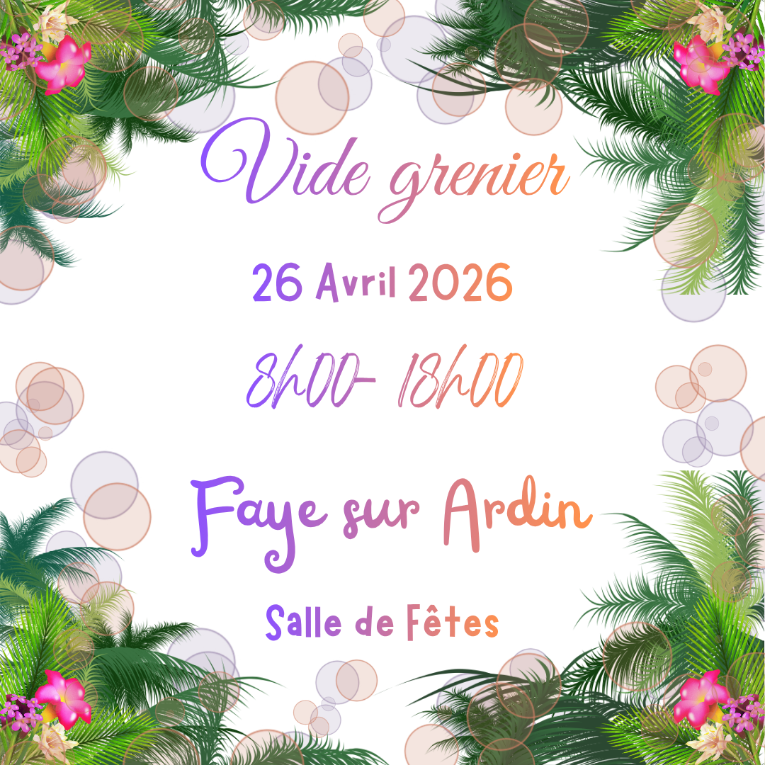 Vide grenier Vide grenier par Energies Spirituelles 85 23 23 people viewed this event. S’inscrire à l’évènement Date et heure 26-04-2026 - 08:00 à 26-04-2026 - 17:00 Lieu Faye sur Ardin Types d’évènements Manifestations Catégorie de l’évènement Vide grenier Partager avec des amis Facebook Twitter Linkedin Xing Pinterest Si vous aimez, partagez !