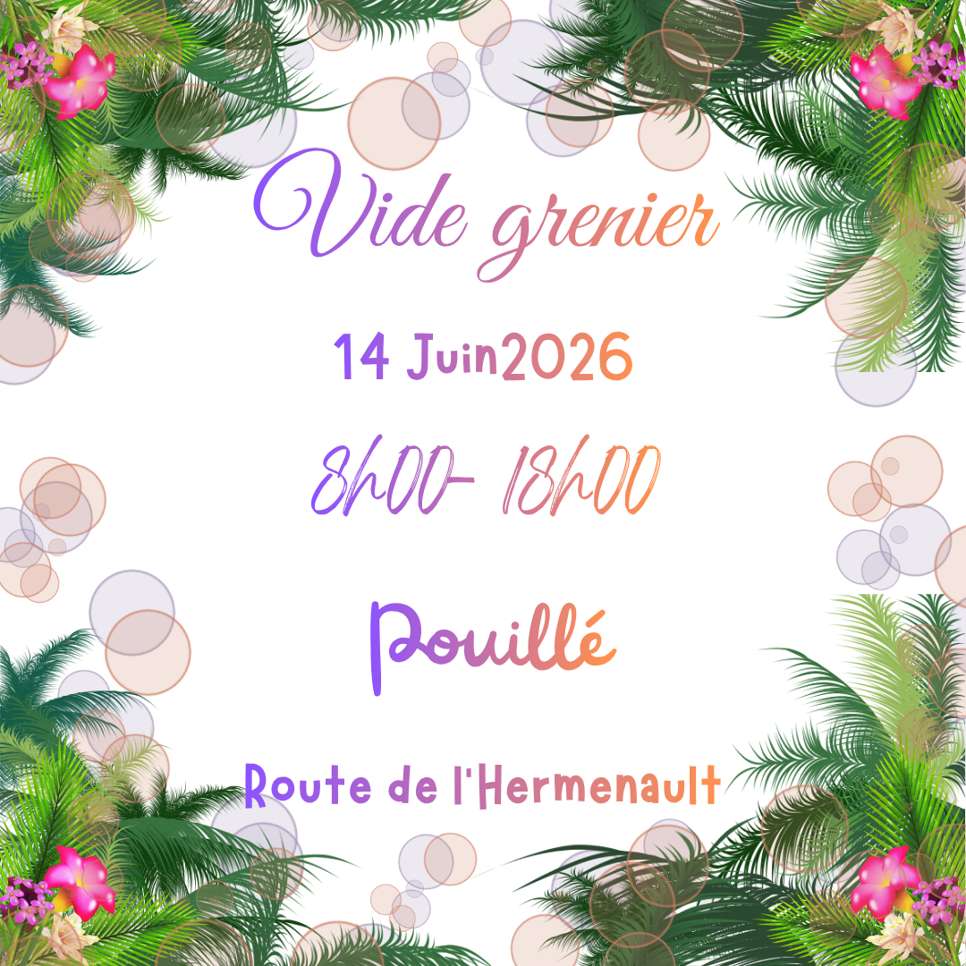 Vide grenier Vide grenier par Energies Spirituelles 85 68 68 people viewed this event. S’inscrire à l’évènement Date et heure 14-06-2026 - 08:00 à 14-06-2026 - 18:00 Lieu Pouillé Types d’évènements Manifestations Catégorie de l’évènement Vide grenier Partager avec des amis Facebook Twitter Linkedin Xing Pinterest Si vous aimez, partagez !