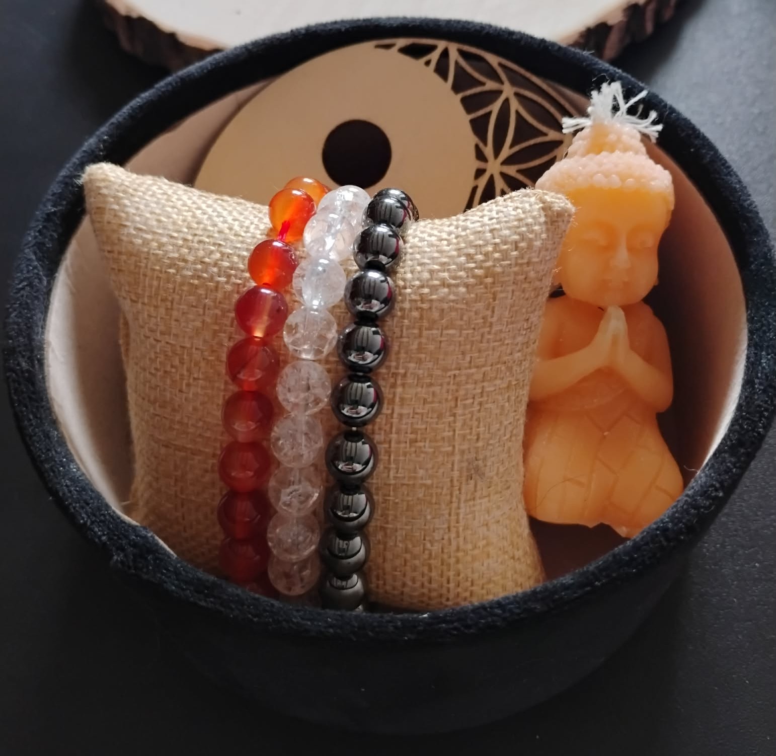 Le coffret est composé de 3 Bracelets, 1 Bougie, 1 Géométrie Sacrée