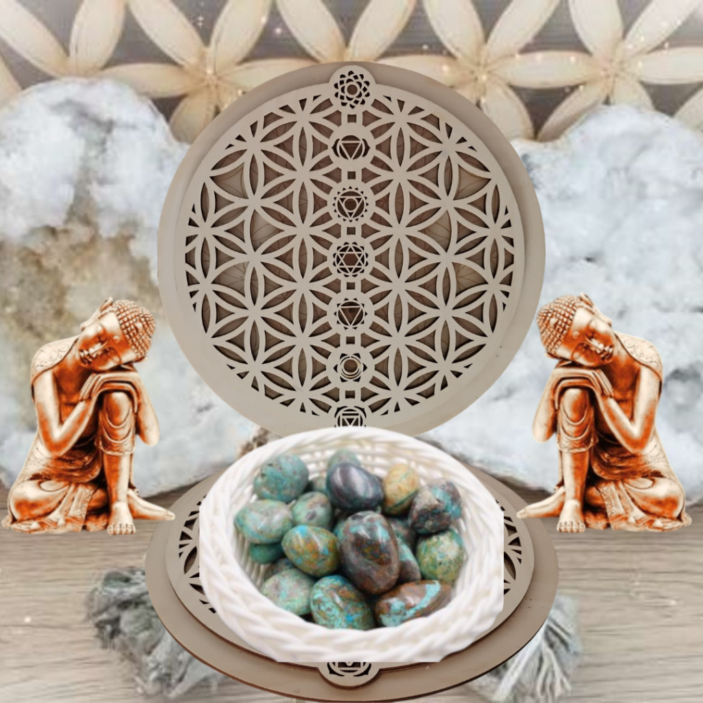 Composée de turquoise et de malachite, la chrysocolle est amorphe et son énergie féminine est soumise au principe du yin. Elle équilibre et apaise tous les centres énergétiques.